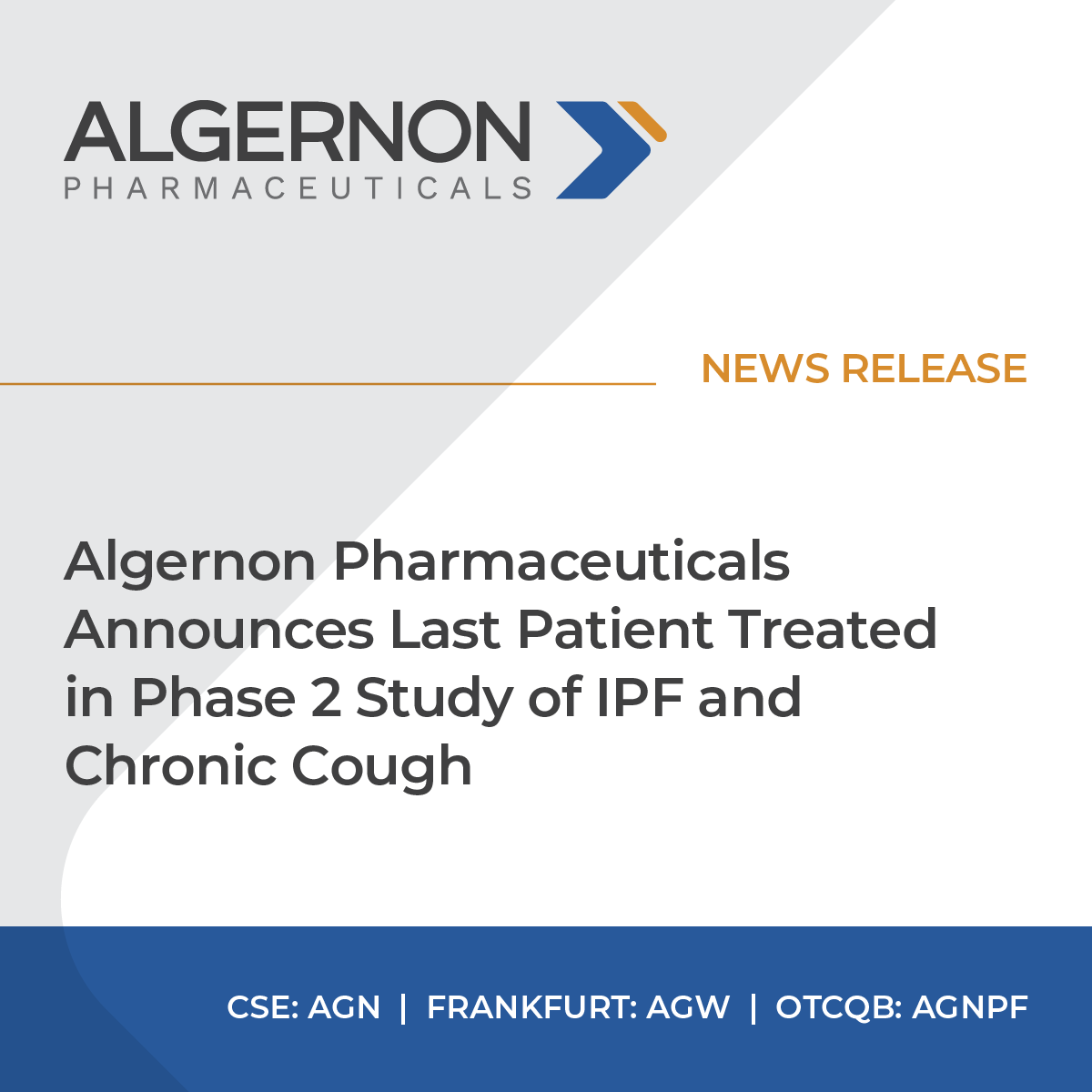 2022-06-13 0700 ET - News Release. Algernons unique approach to drug discovery is based on the concept of drug repurposing. Algernon Pharmaceuticals Announces Database Lock in Phase 2 Study of IPF and Chronic Cough.